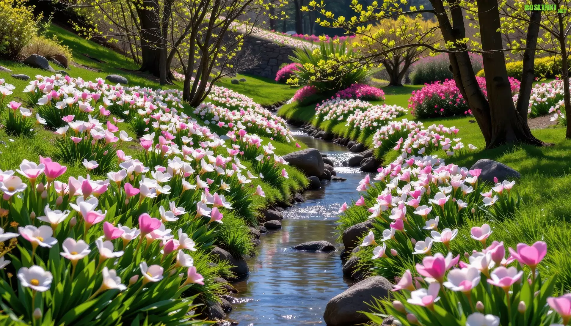 Rośliny: Kwiaty, Strumień, Drzewa, Wiosna, Grafika
