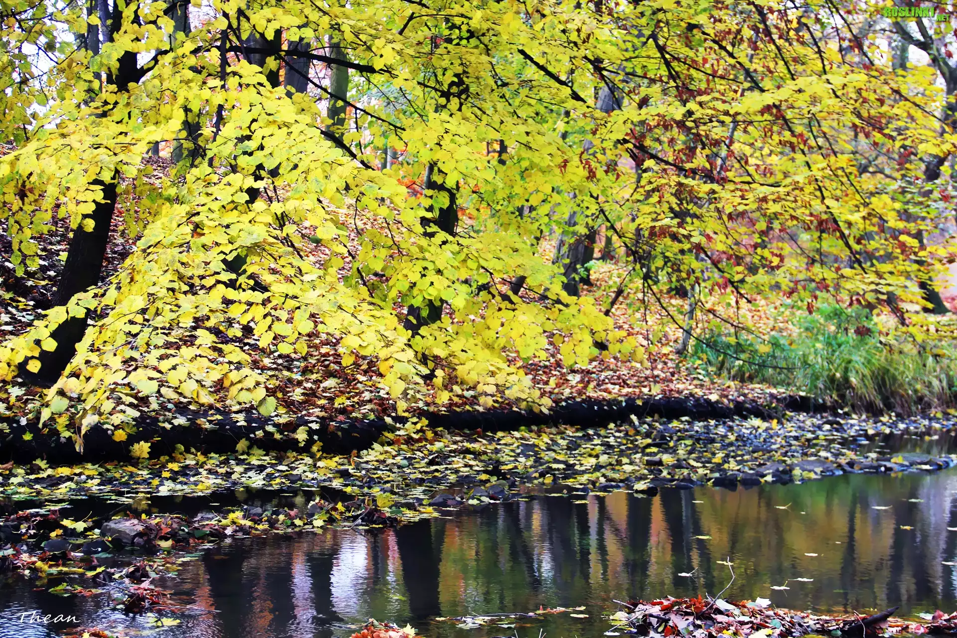 Rośliny: Strumyk, Odbicie, Żółte, Liście, Jesień