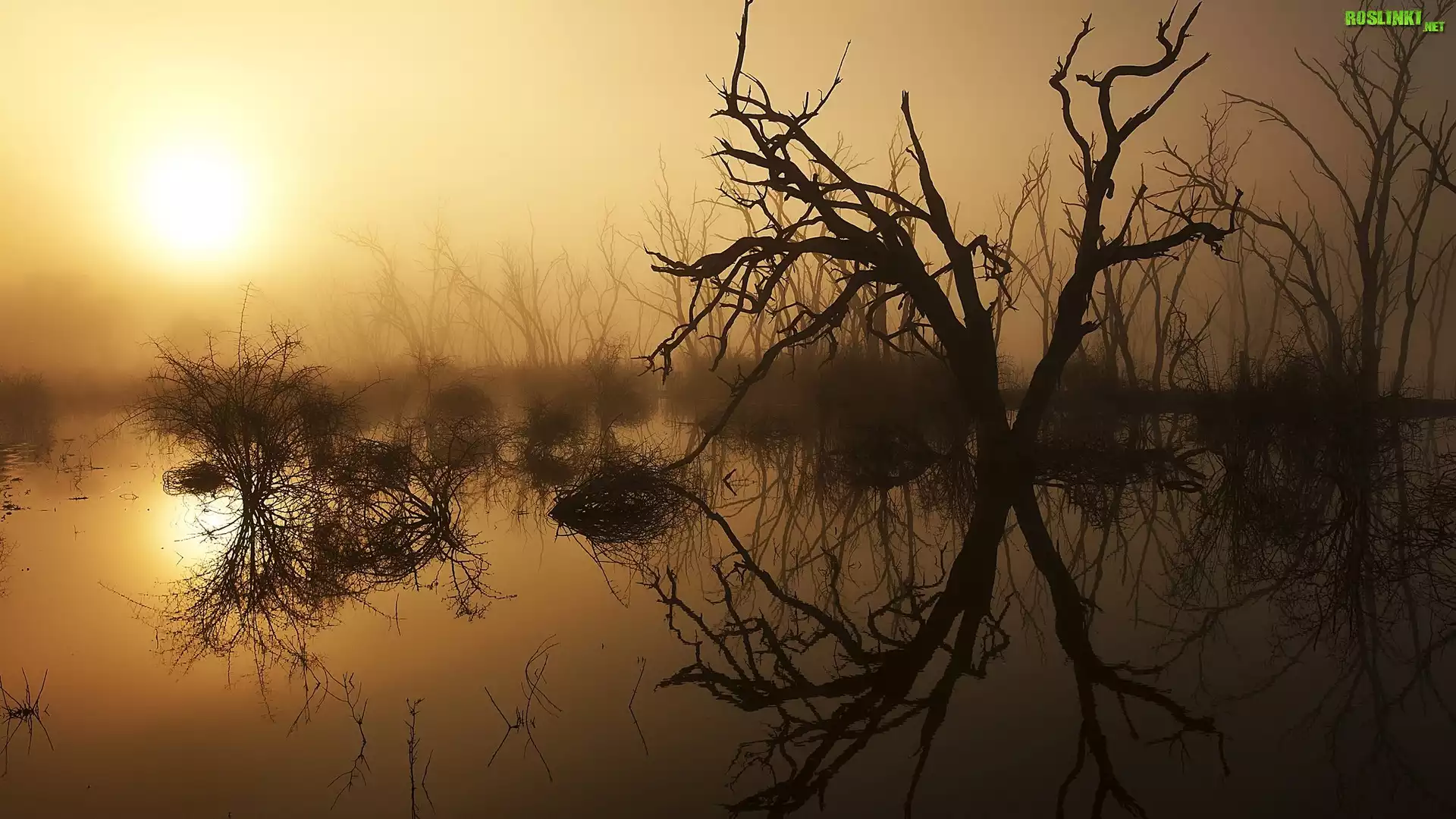 Rośliny: Suche, Drzewa, Woda, Wschód słońca, Mgła