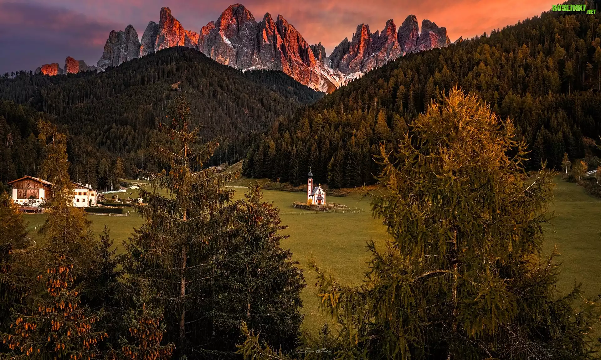 Włochy, Południowy Tyrol, Góry, Dolomity, Kościół św Jana, Wieś, Santa Maddalena, Dolina Val di Funes, Drzewa |