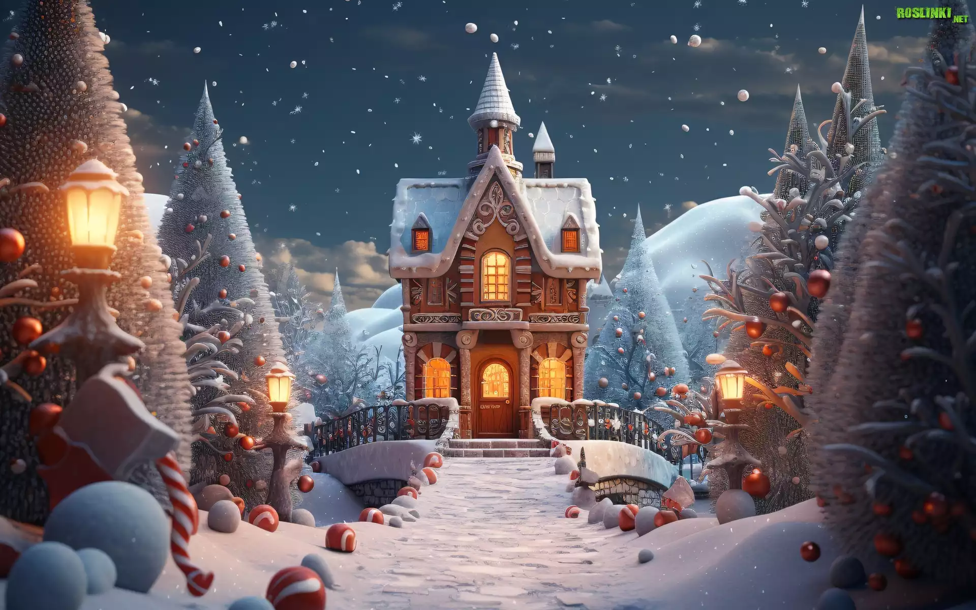 Rośliny: Zima, Dom, Drzewa, Światła, Bombki, Śnieg, Grafika