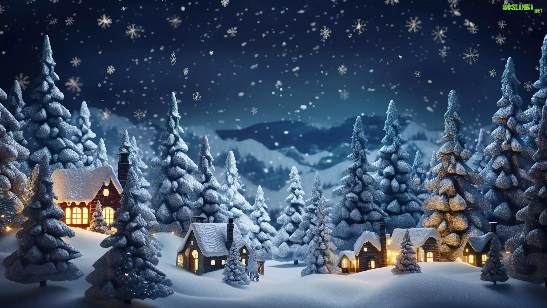 Rośliny: Zima, Drzewa, Domki, Światła, Śnieg, Grafika