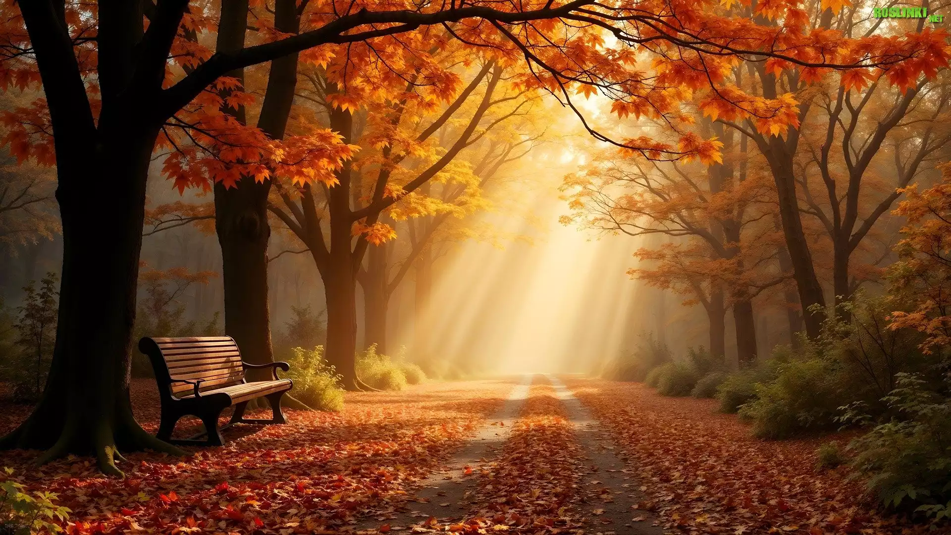 Rośliny: Jesień, Park, Drzewa, Ławka, Opadłe, Liście, Przebijające światło