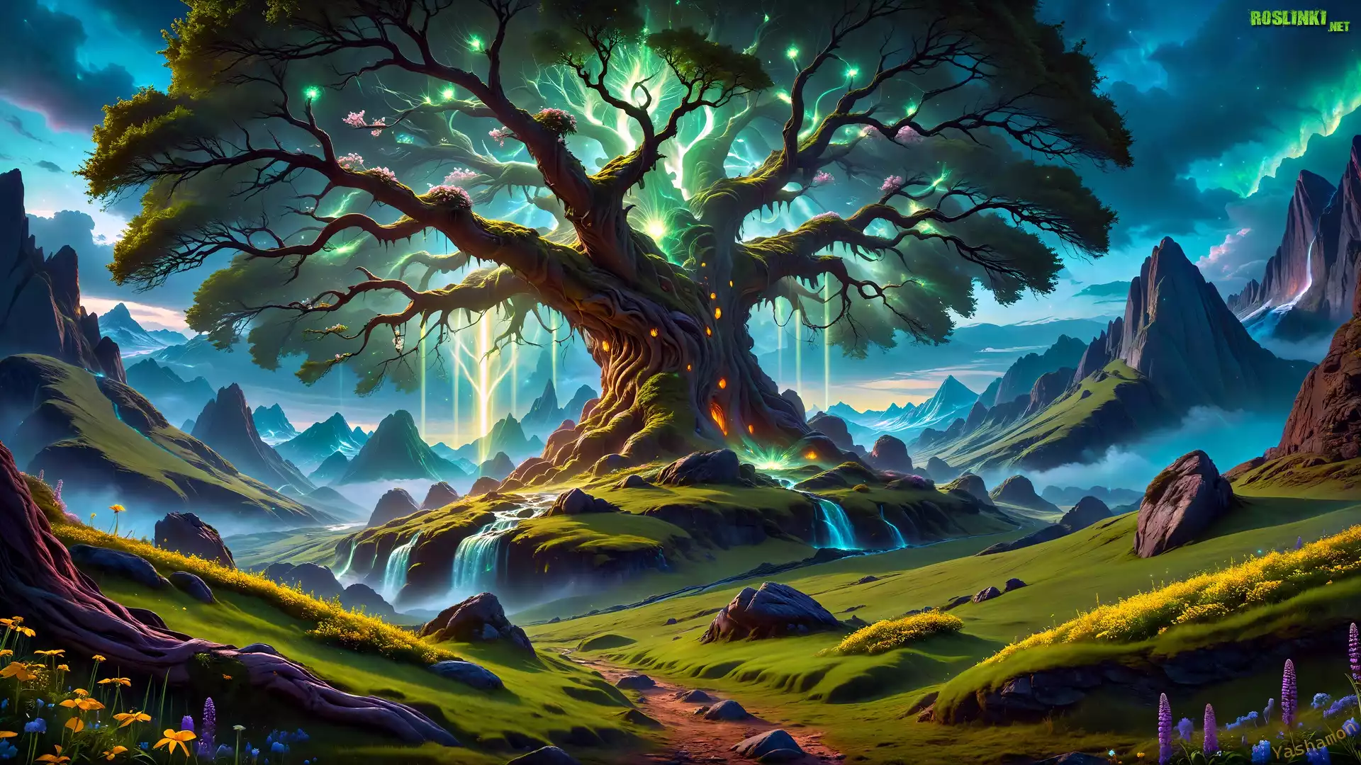 Rośliny: Drzewo, Światło, Góry, Łąka, Grafika