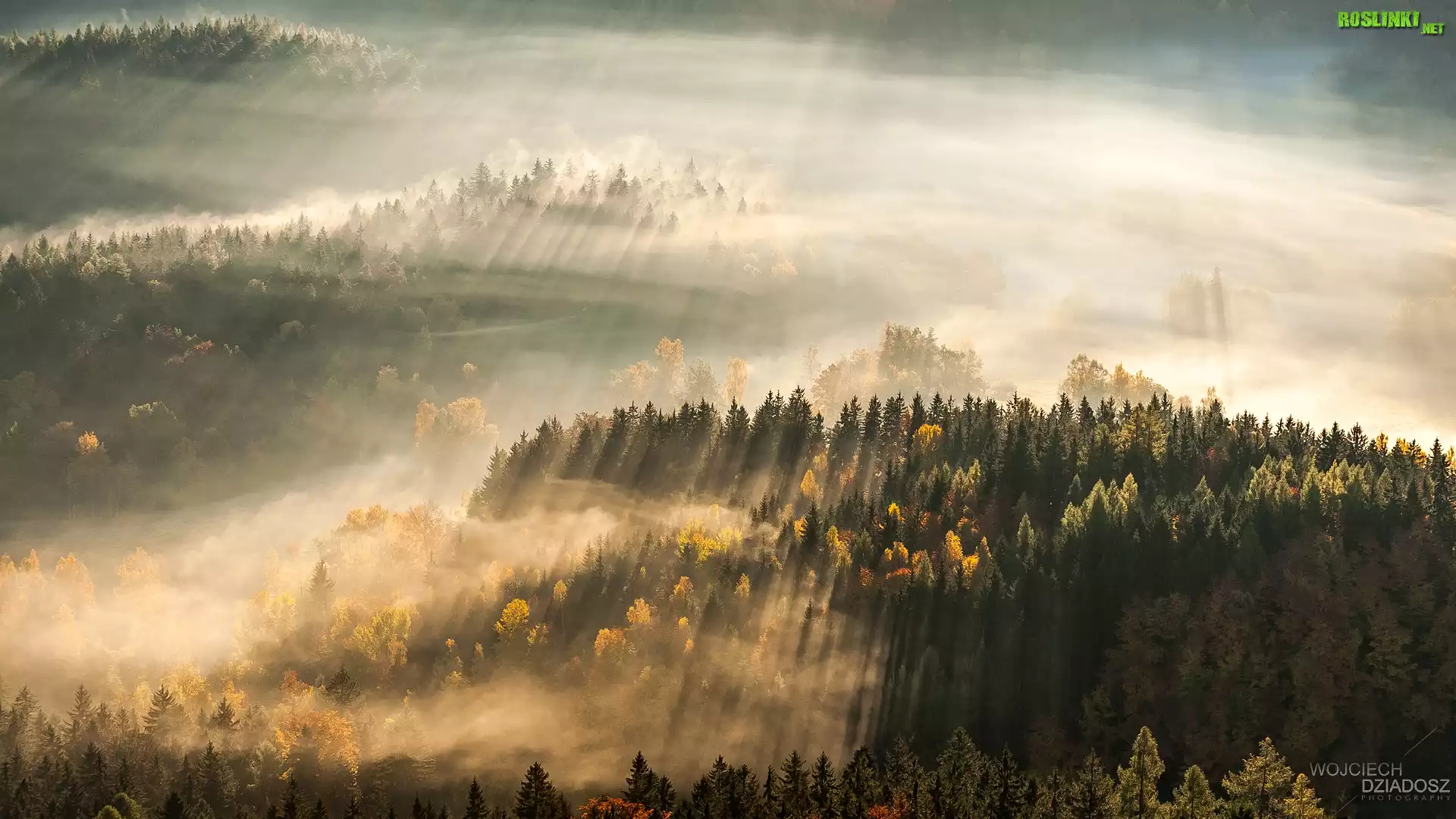 Rośliny: Polska, Sudety, Rudawy Janowickie, Przebijające światło, Mgła, Lasy, Drzewa, Z lotu ptaka