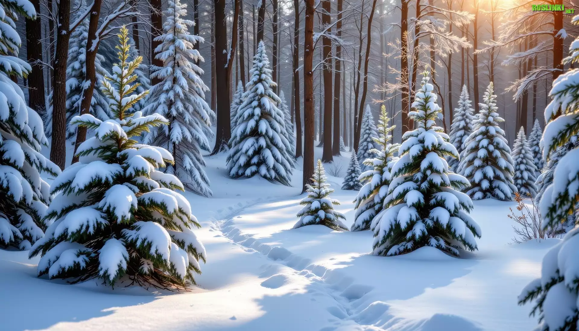 Rośliny: Las, Świerki, Przebijające światło, Zima, Grafika AI