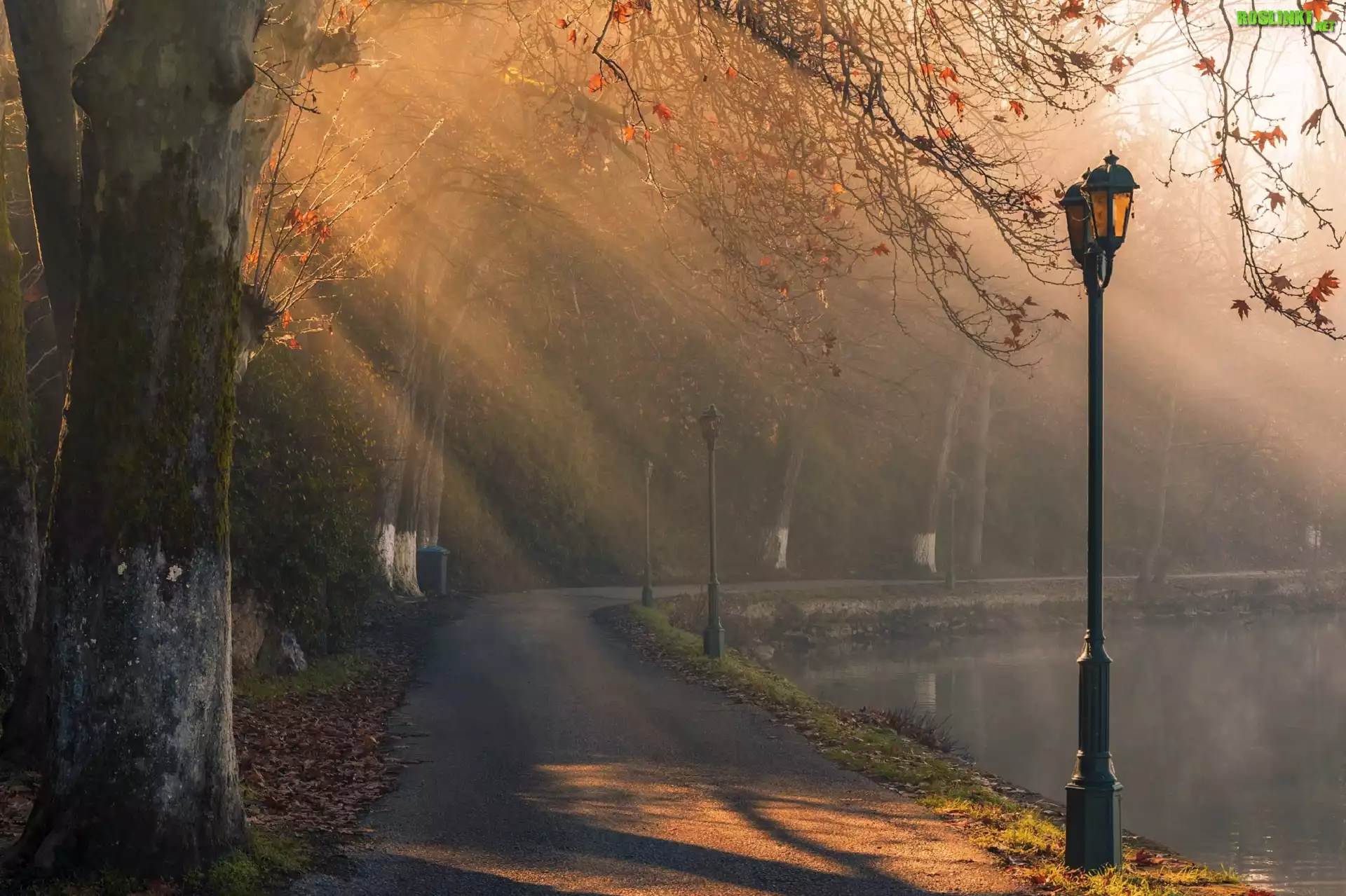 Jesień, Park, Staw, Drzewa, Latarnie, Droga, Mgła, Przebijające światło