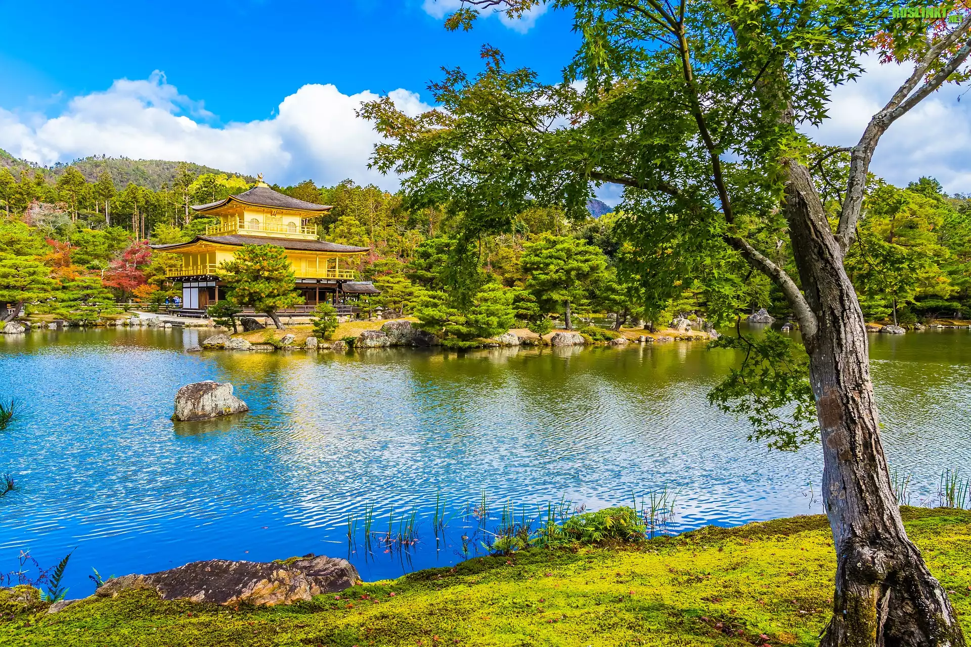 Rośliny: Świątynia Kinkakuji, Złoty Pawilon, Drzewo, Staw Kyko chi, Kioto, Japonia