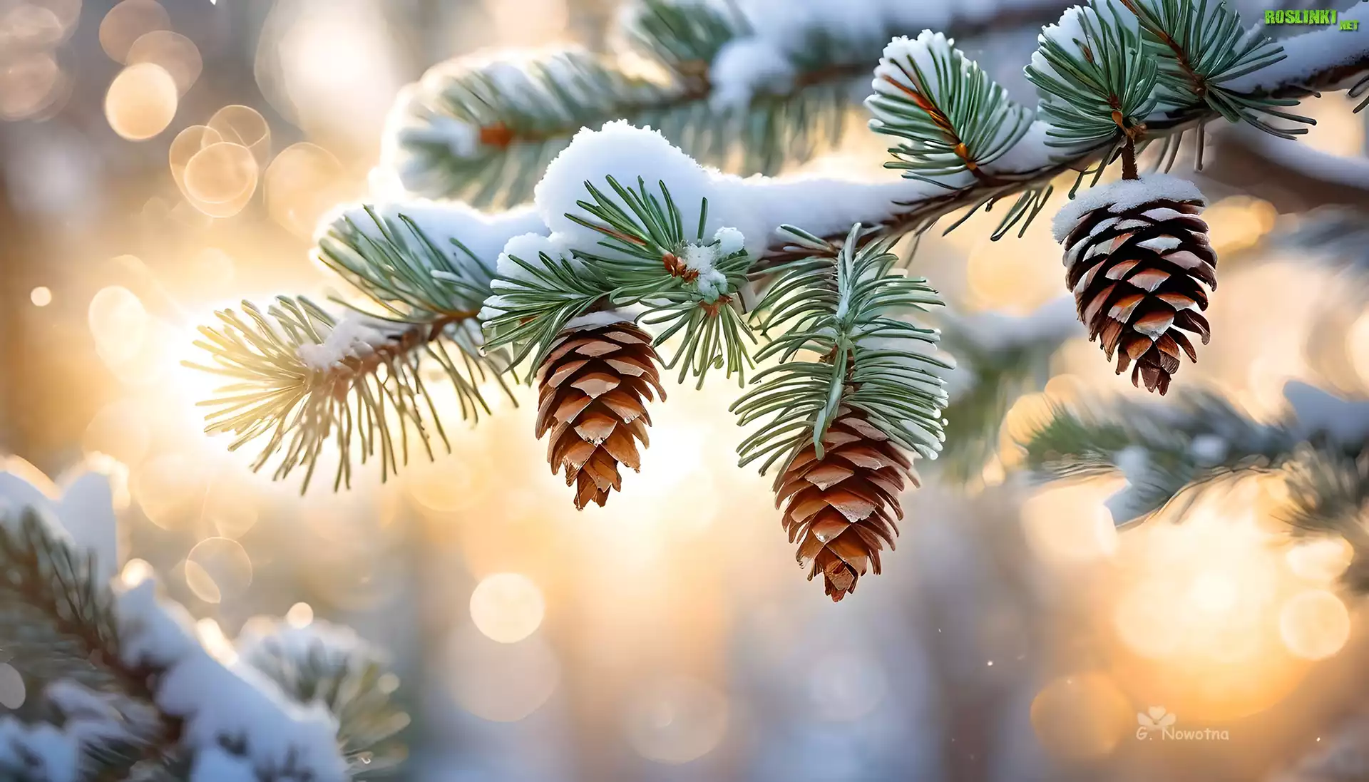 Rośliny: Gałązka, Świerk, Szyszki, Śnieg, Grafika