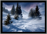 Zima, Zbocze, Drzewa, Świerki, Zamieć, Grafika AI