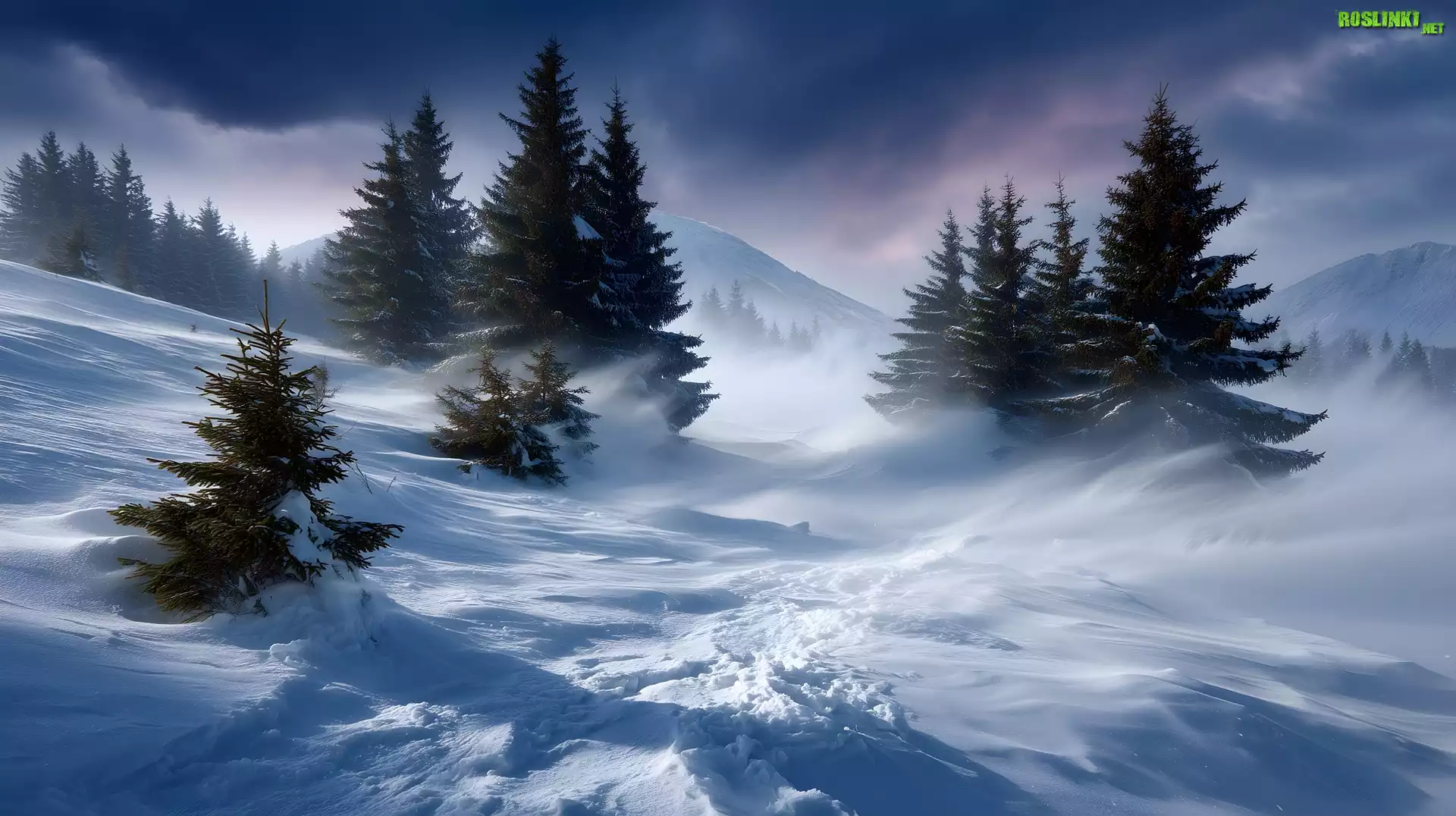 Rośliny: Zima, Zbocze, Drzewa, Świerki, Zamieć, Grafika AI