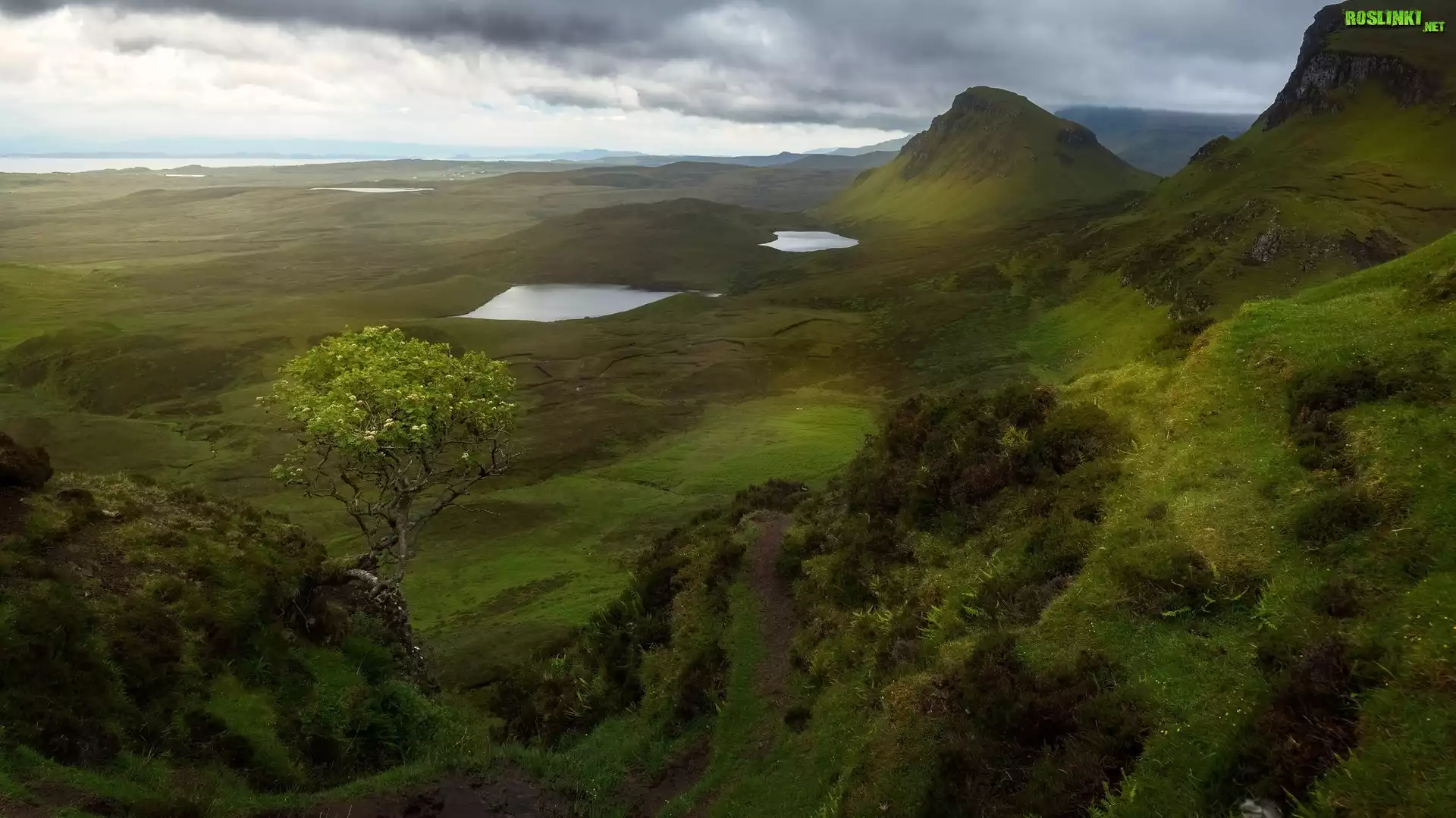 Rośliny: Wzgórza, Jeziora, Roślinność, Drzewo, Chmury, Wyspa Skye, Osuwisko, Quiraing, Szkocja