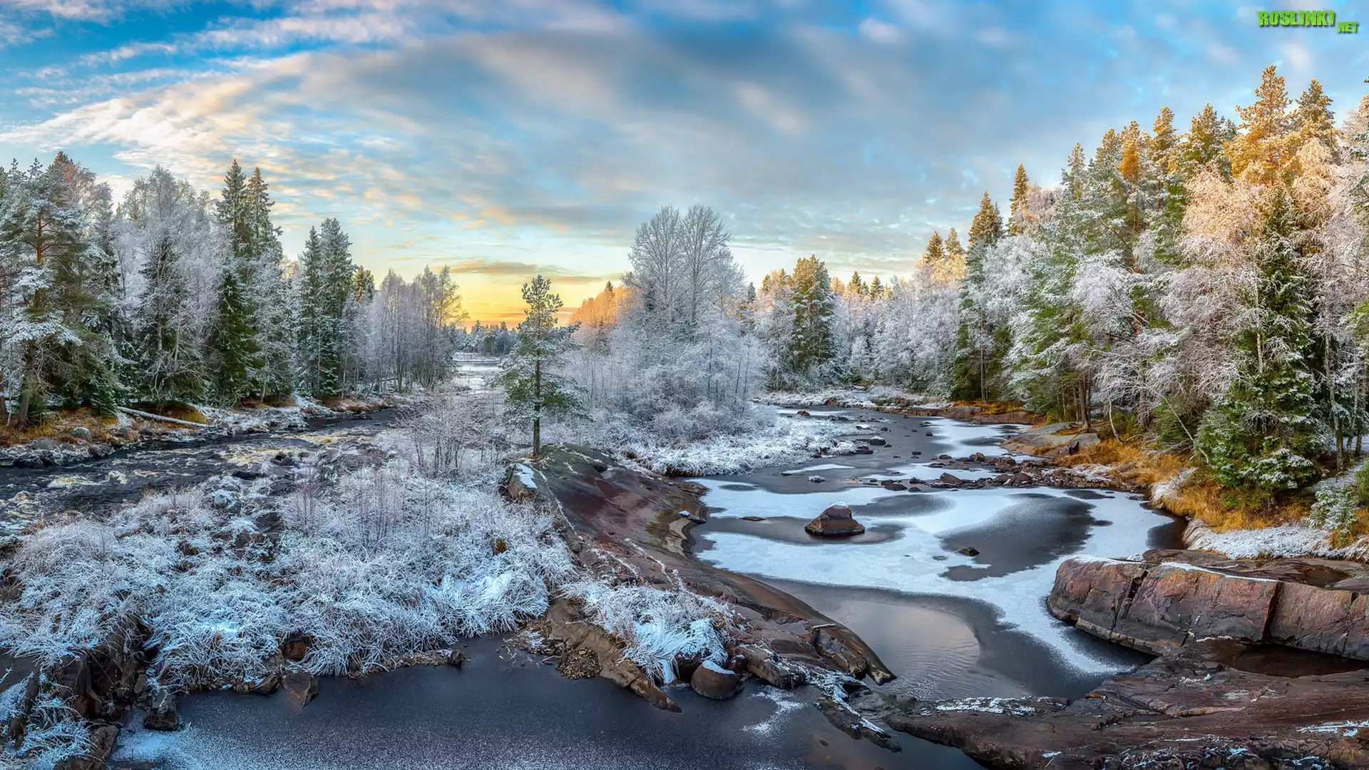 Rośliny: Finlandia, Szron, Rzeka Kiiminkijoki, Kamienie, Las, Drzewa
