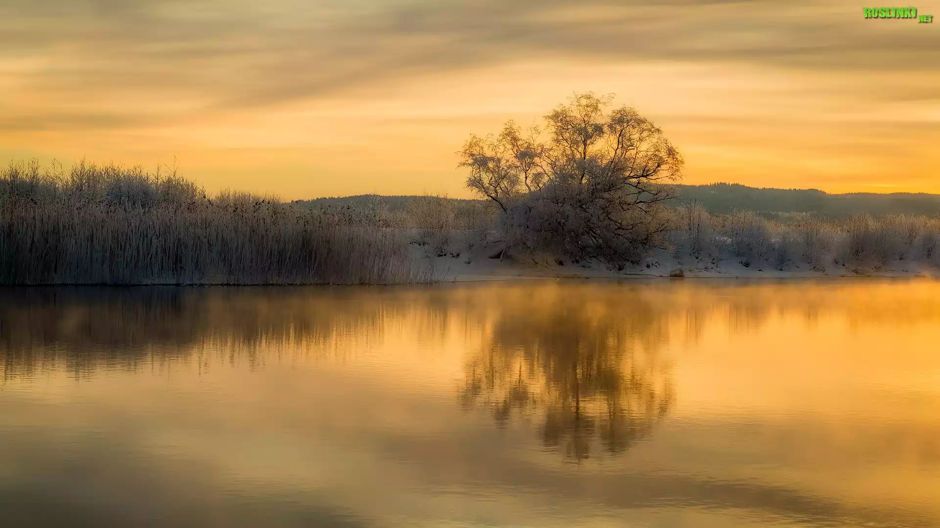 Rośliny: Zima, Szron, Drzewo, Odbicie, Jezioro, Wschód słońca