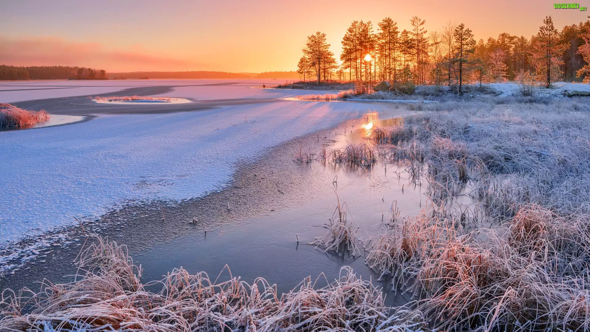 Rośliny: Zima, Jezioro, Drzewa, Szuwary, Oszronione, Słoneczny, Dzień