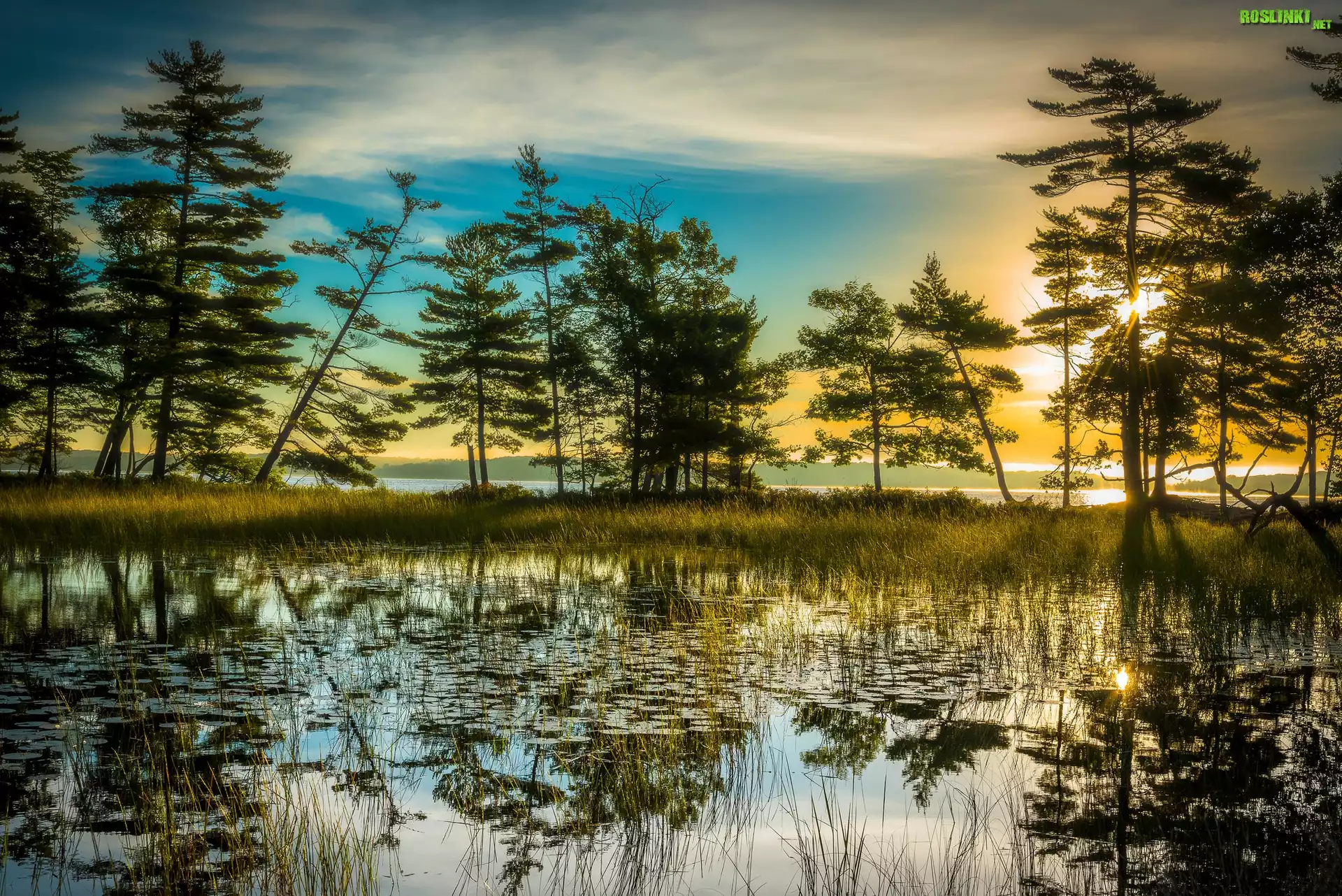 Rośliny: Jezioro, Szuwary, Trawa, Drzewa, Chmury, Promienie, Zachód słońca