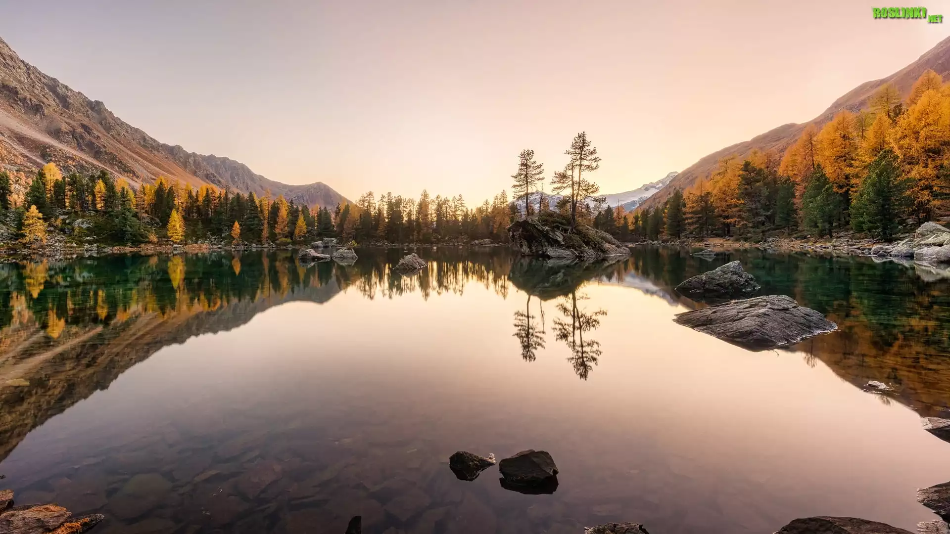 Rośliny: Szwajcaria, Kanton Gryzonia, Góry, Alpy, Jezioro, Lago di Saoseo, Kamienie, Drzewa, Jesień, Odbicie
