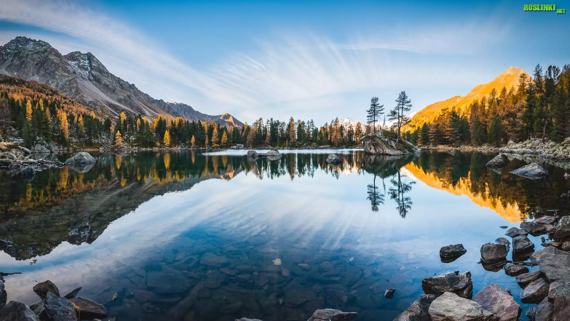 Szwajcaria, Kanton Gryzonia, Góry, Alpy, Dolina Val di Campo, Jezioro Lago di Saoseo, Kamienie, Drzewa, Jesień, Odbicie |