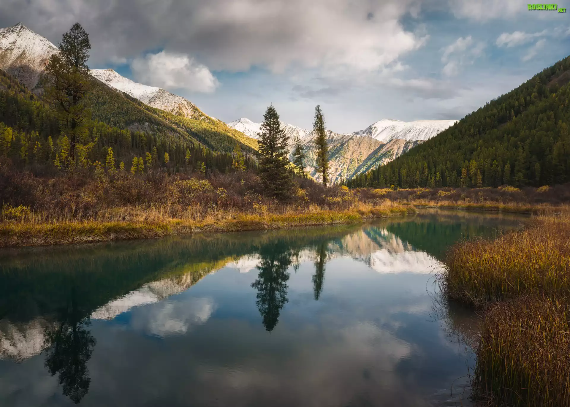 Rośliny: Rosja, Tajga, Góry Ałtaj, Drzewa, Rzeka, Chmury, Odbicie