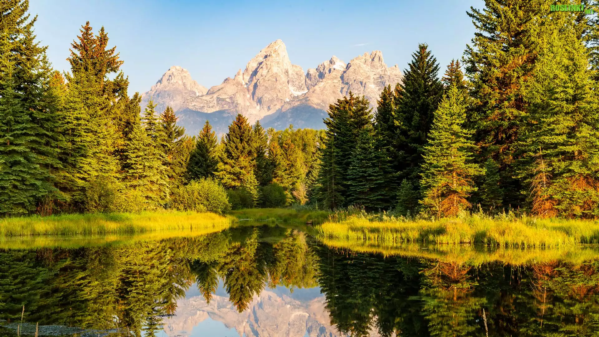 Rośliny: Stany Zjednoczone, Wyoming, Park Narodowy Grand Teton, Góry, Drzewa, Rzeka, Odbicie