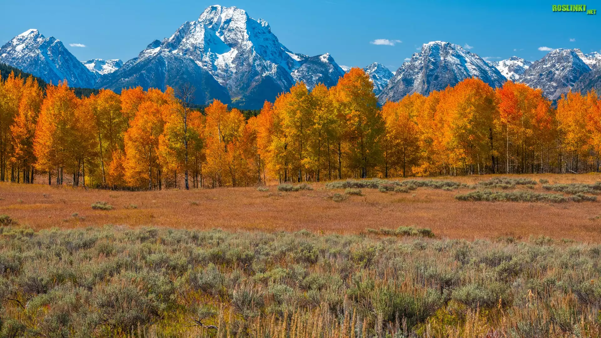 Jesień, Park Narodowy Grand Teton, Góry, Teton Range, Pożółkłe, Drzewa, Stan Wyoming, Stany Zjednoczone |