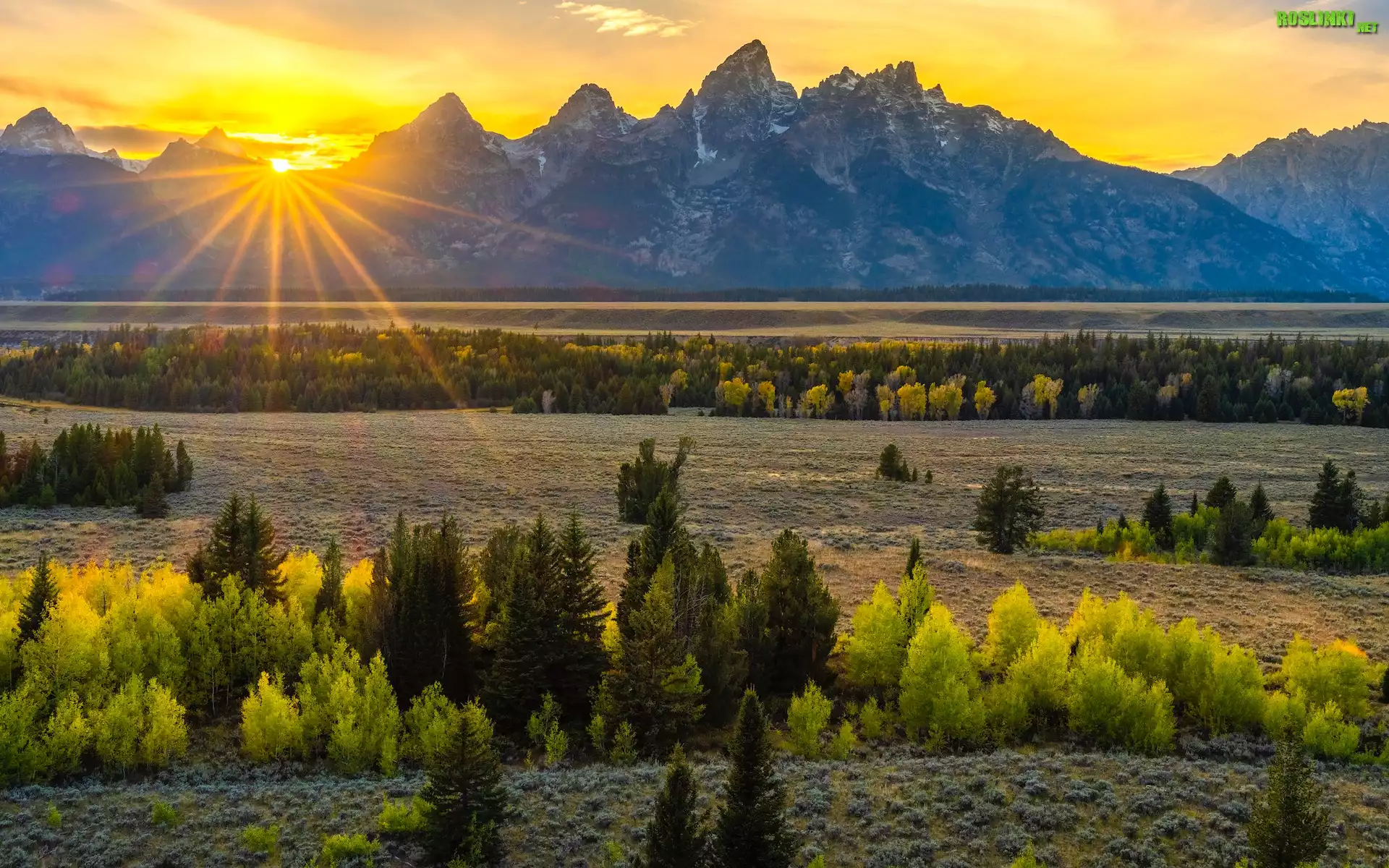Rośliny: Stany Zjednoczone, Wyoming, Park Narodowy Grand Teton, Promienie słońca, Góry, Drzewa