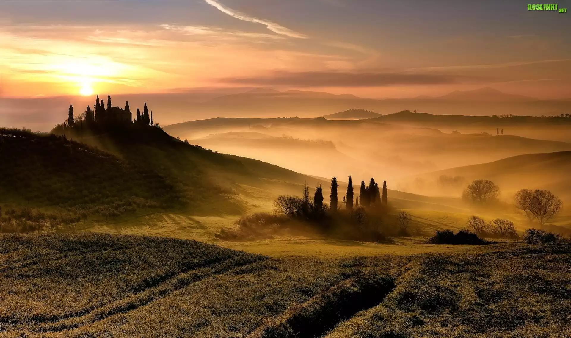 Rośliny: Włochy, Tosaknia, Wzgórza, Mgła, Wschód słońca, Drzewa