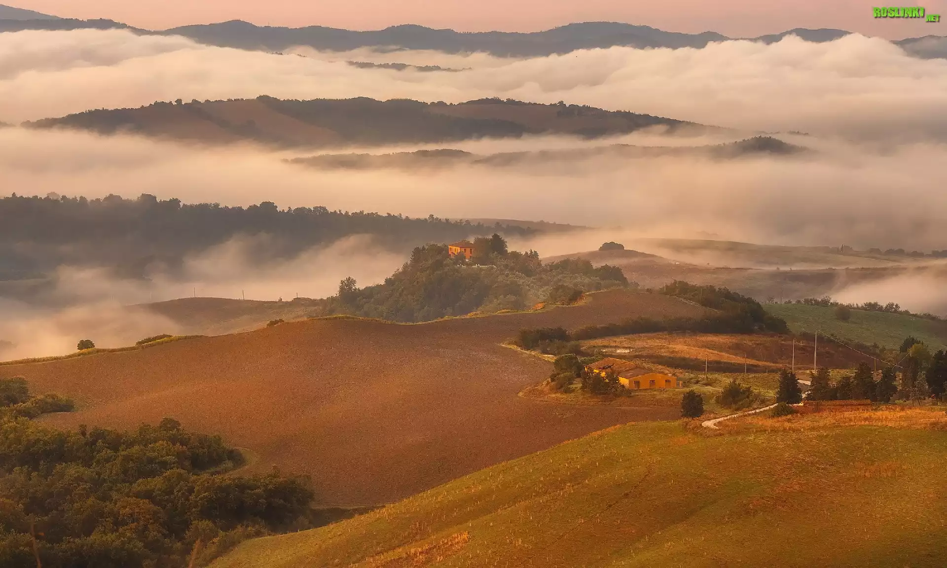 Rośliny: Włochy, Toskania, Wzgórza, Domy, Droga, Drzewa, Chmury, Mgła