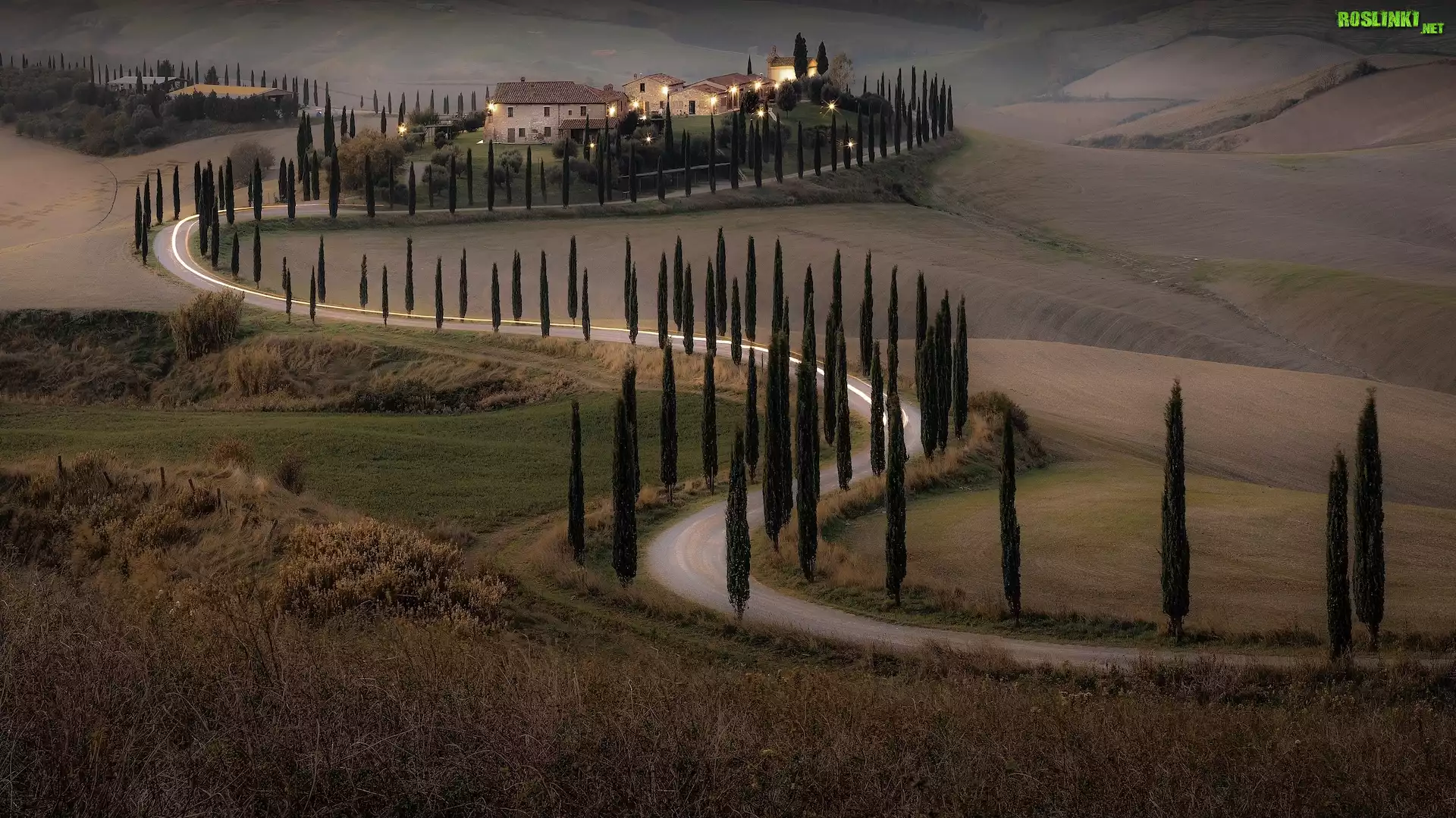 Rośliny: Włochy, Toskania, Wzgórza, Droga, Drzewa, Cyprysy, Dom, Pola