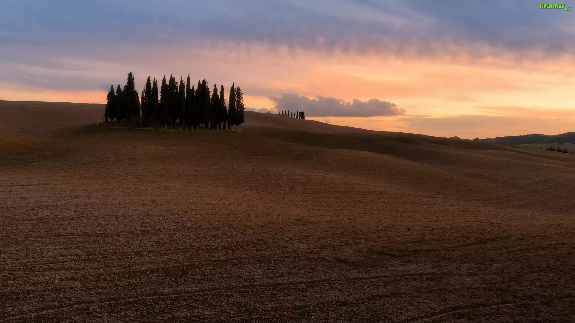 Włochy, Toskania, Pola, Wzgórza, Drzewa, Cyprysy, Zachód słońca