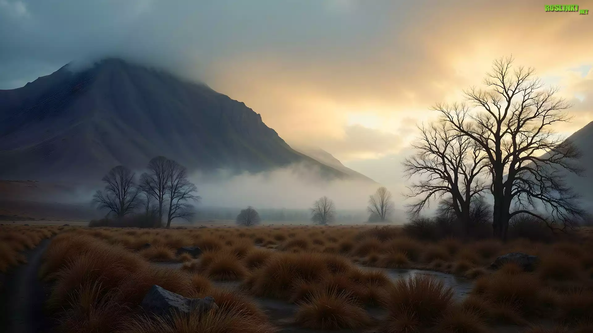 Rośliny: Jesień, Drzewa, Kępki, Traw, Mokradła, Mgła, Góra