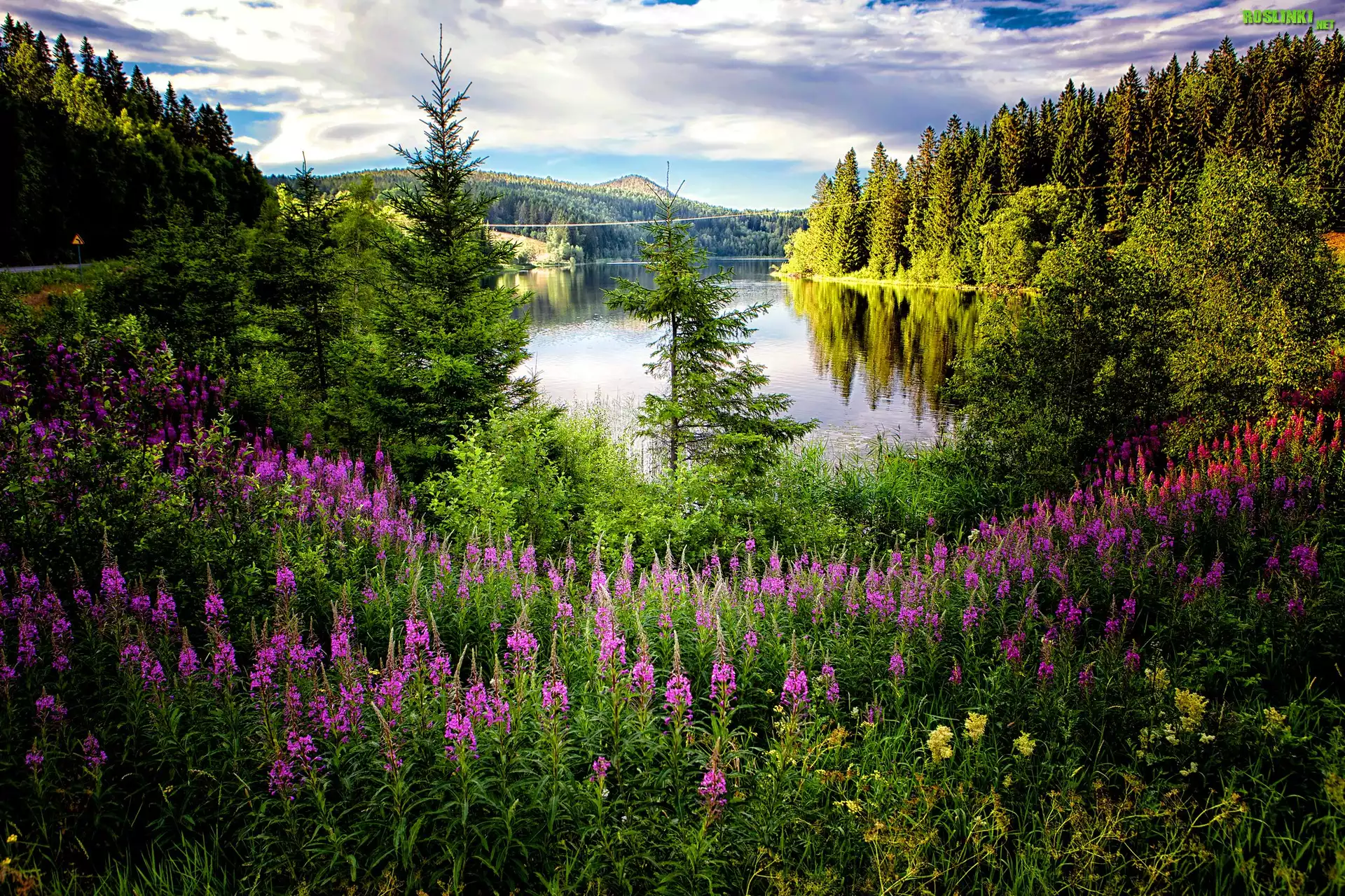 Rośliny: Kwiaty, Trawa, Rośliny, Drzewa, Jezioro, Wzgórza, Niebo, Chmury
