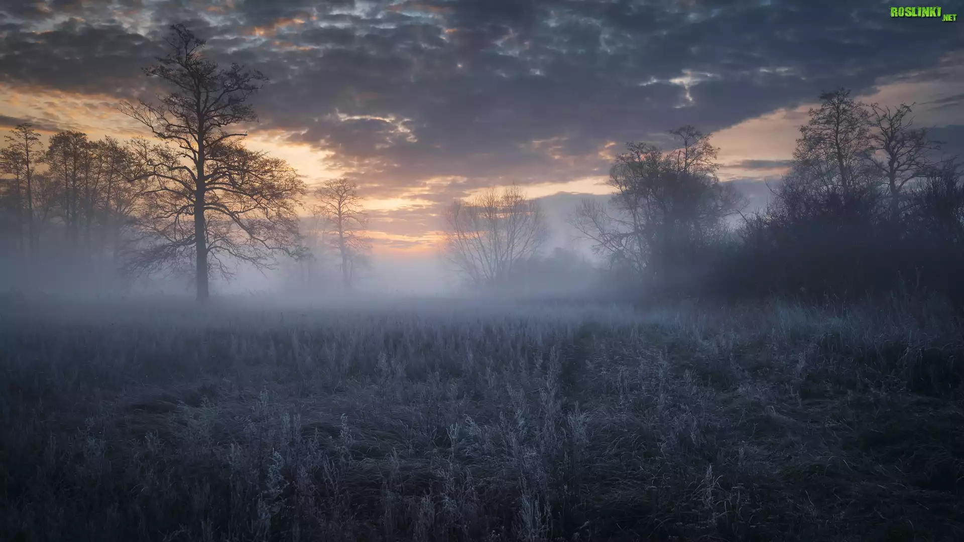 Rośliny: Drzewa, Trawa, Szron, Mgła, Zachód słońca, Chmury