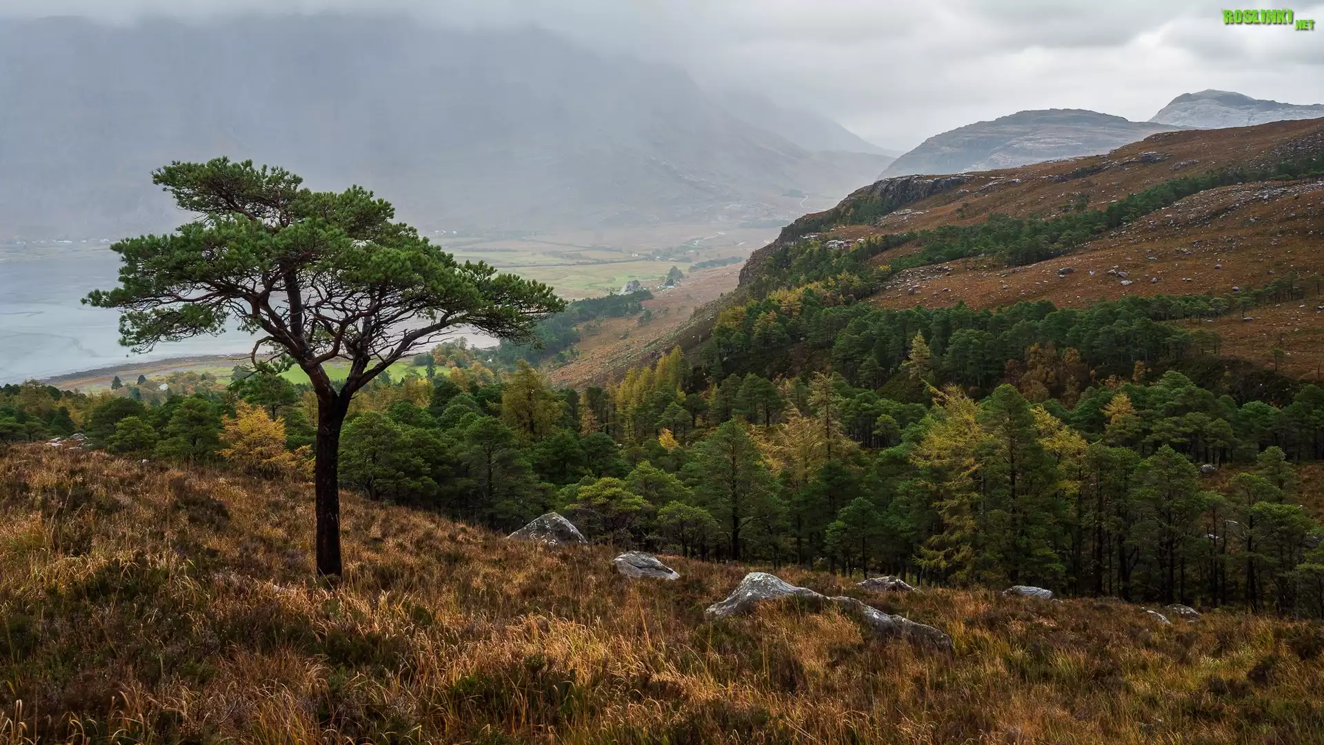 Rośliny: Góry, Mgła, Drzewa, Trawa