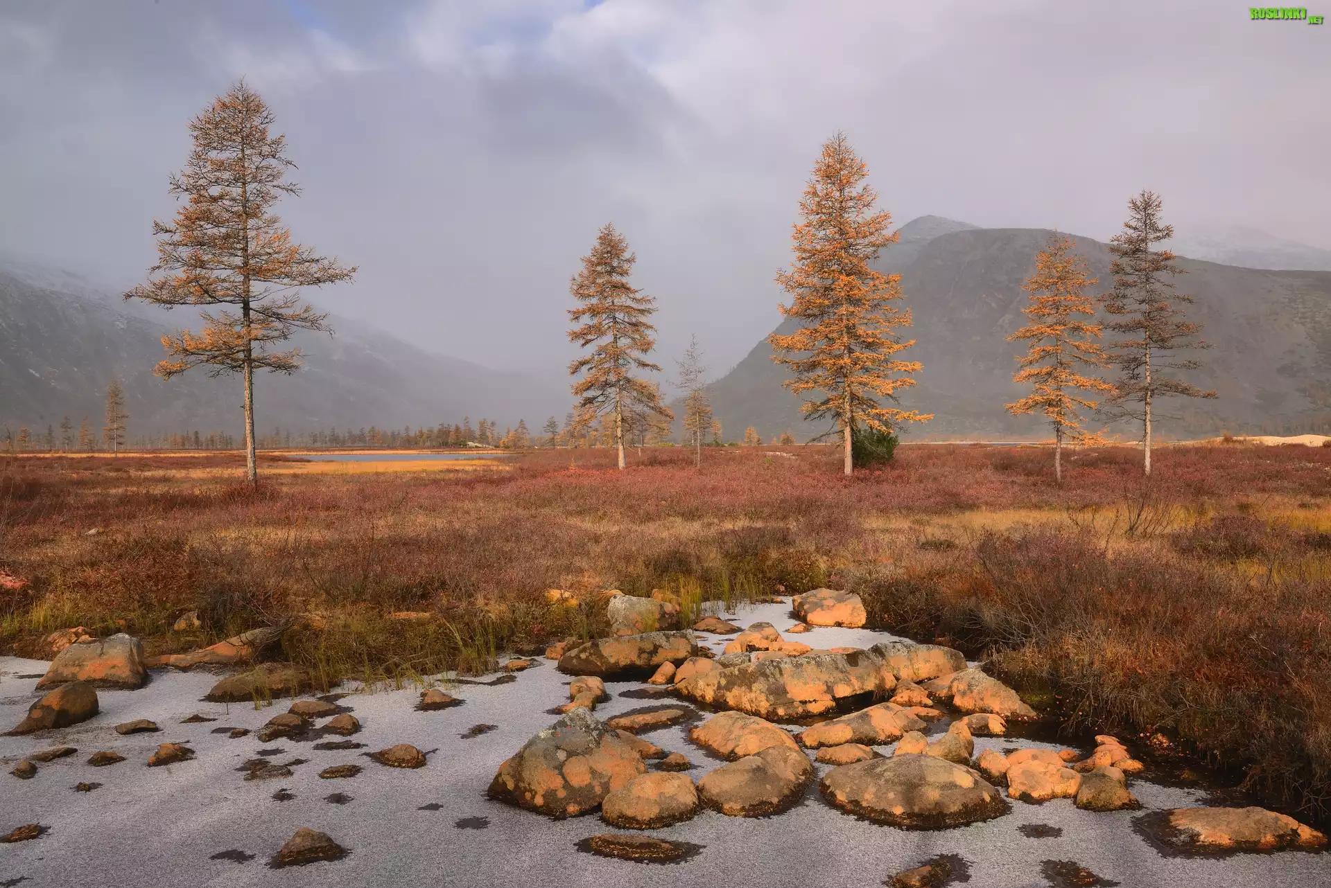 Góry Kołymskie, Drzewa, Kamienie, Rośliny, Trawa, Mgła, Jesień, Kołyma, Obwód magadański, Rosja |