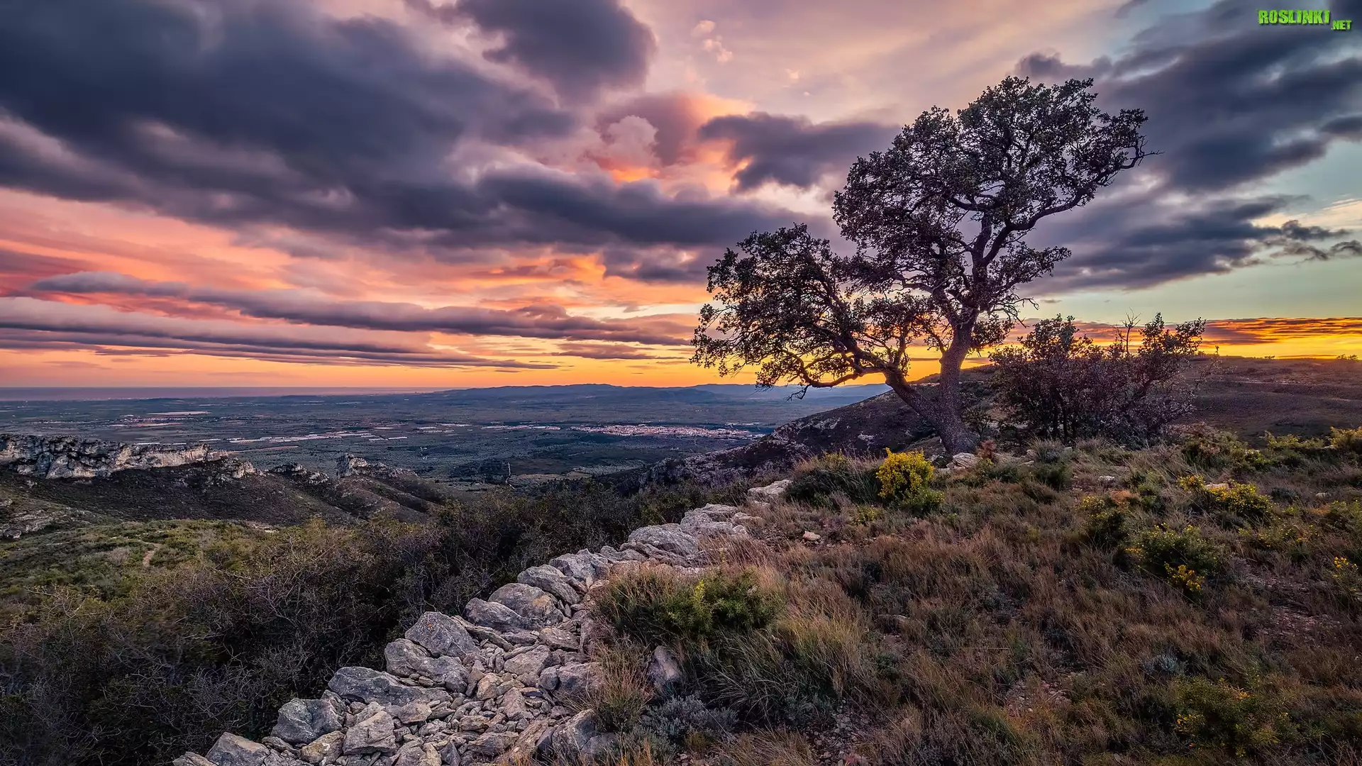 Rośliny: Zachód słońca, Kolorowe, Niebo, Chmury, Drzewo, Kamienie, Trawa