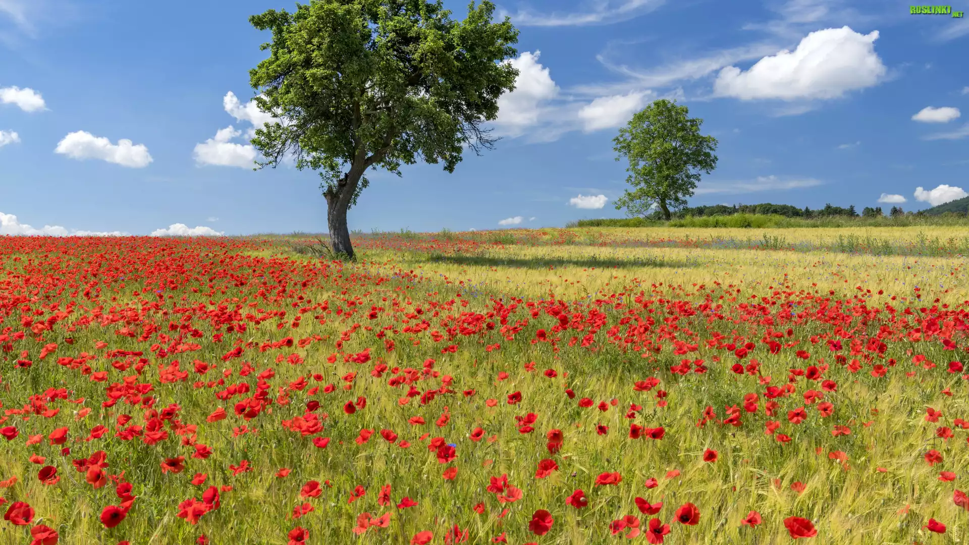 Rośliny: Łąka, Maki, Trawa, Drzewa