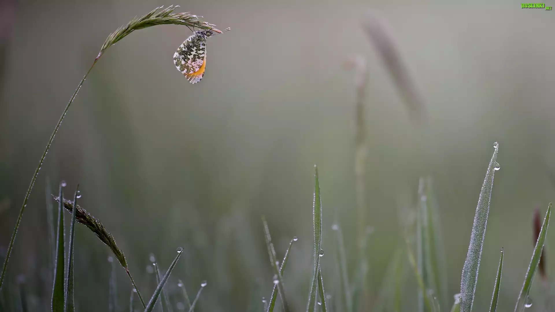 Rośliny: Motyl, Zorzynek rzeżuchowiec, Trawa, Krople