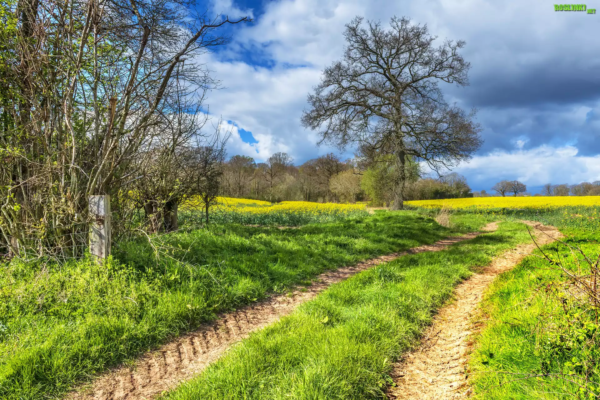 Rośliny: Droga, Trawa, Pole, Rzepak, Drzewa