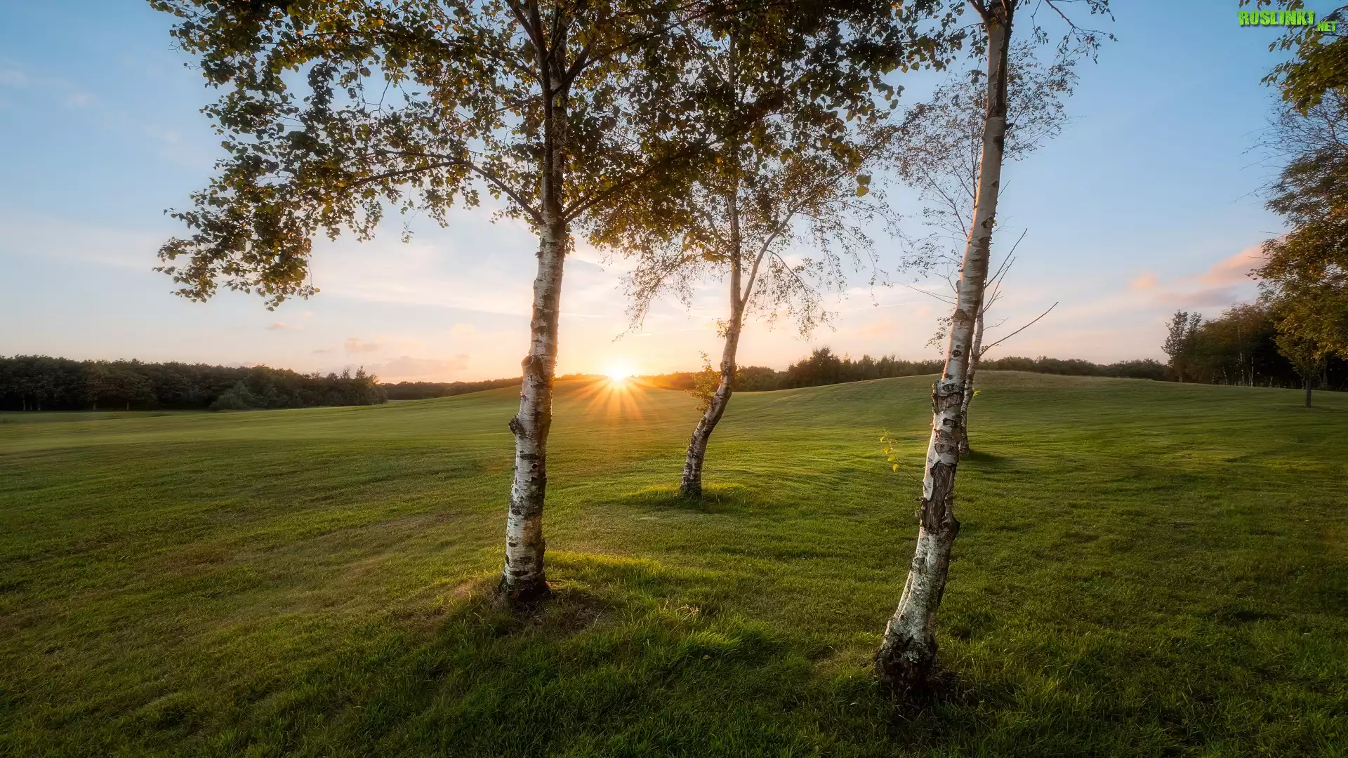 Rośliny: Pole, Drzewa, Brzozy, Trawa, Promienie słońca