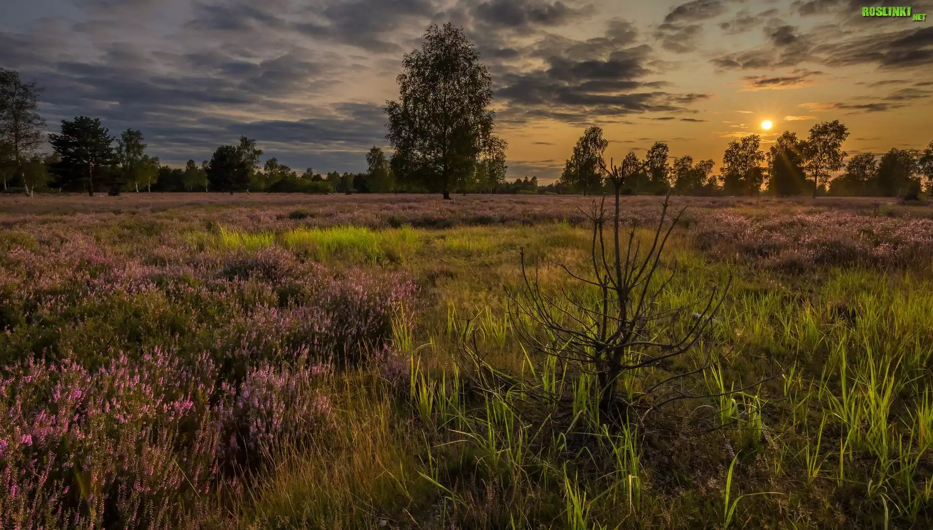 Rośliny: Wrzosowisko, Trawa, Wrzosy, Drzewa, Promienie słońca, Zachód słońca