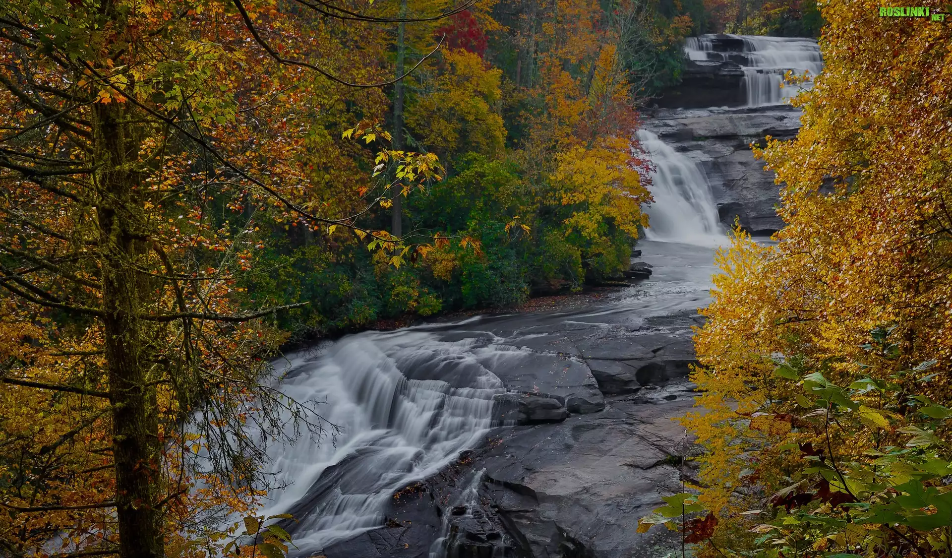 Jesień, Żółte, Drzewa, Skały, Wodospad, Triple Falls, Rzeka, Little River, Las, DuPont State Forest, Karolina Północna, Stany Zjednoczone |