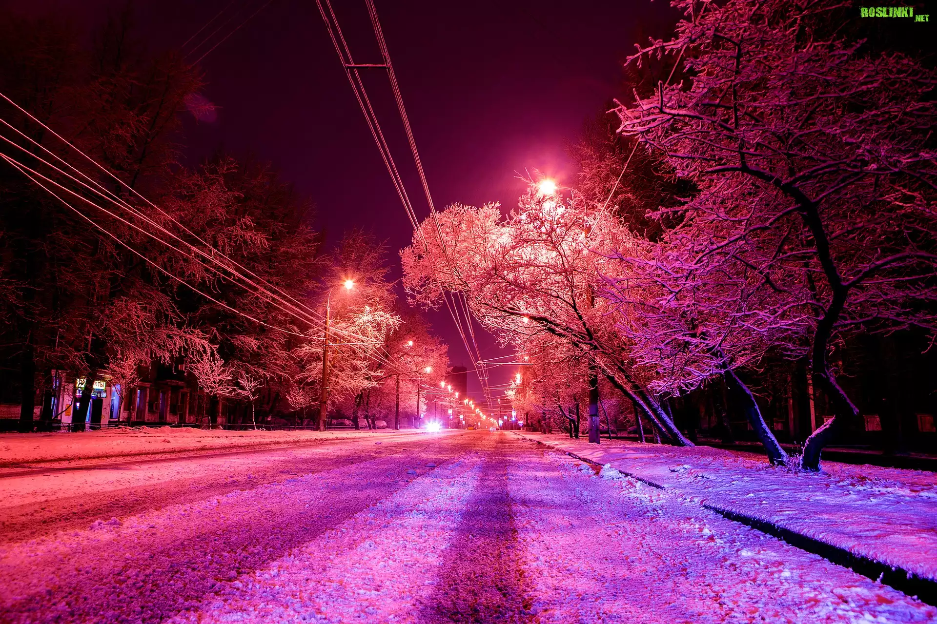 Rośliny: Zima, Ulica, Drzewa, Światła, Latarnie, Noc, Śnieg