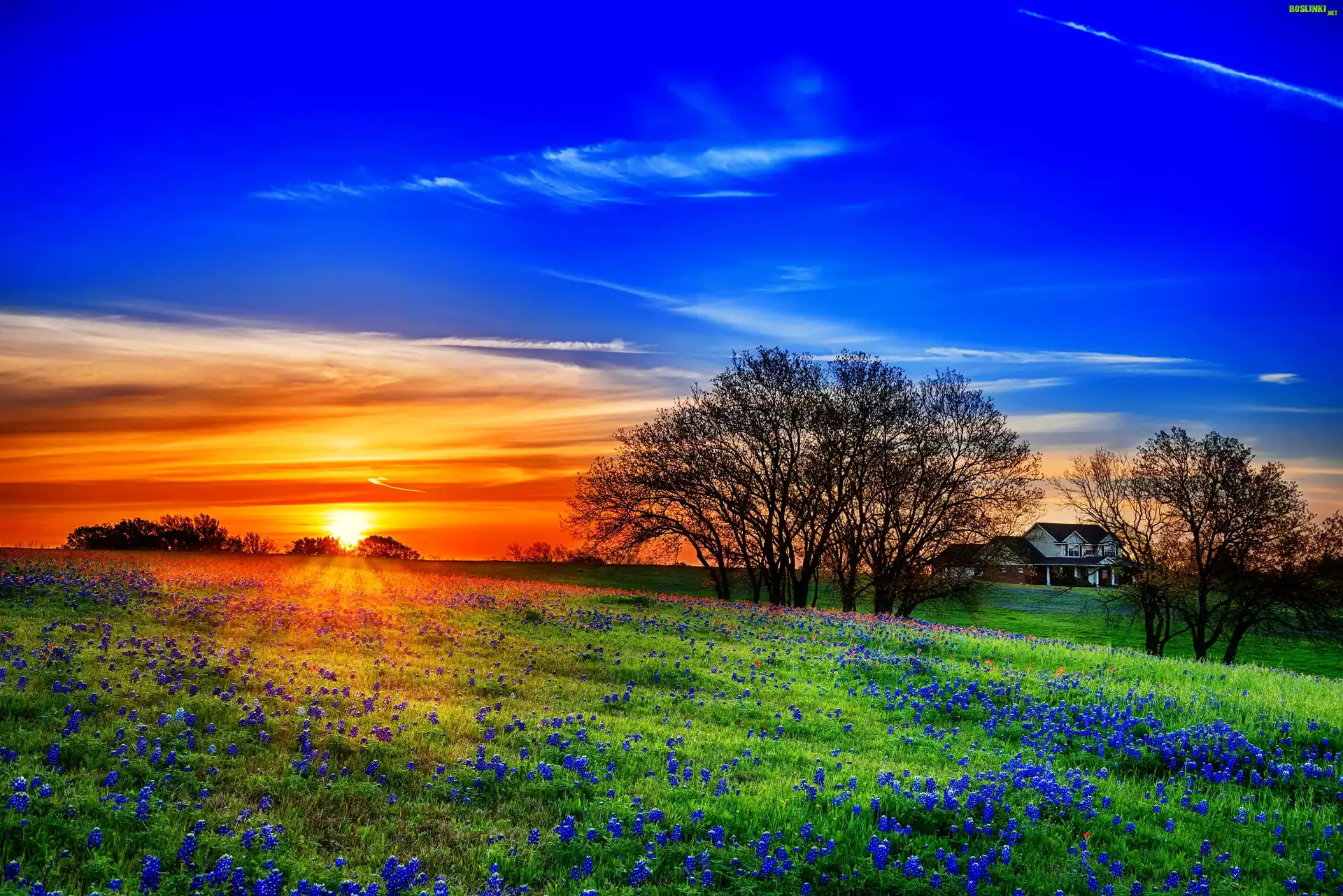 Rośliny: Farma, Drzewa, Łąki, Szafirki, Wschód, Słońca, Wiosna, Texsas, USA