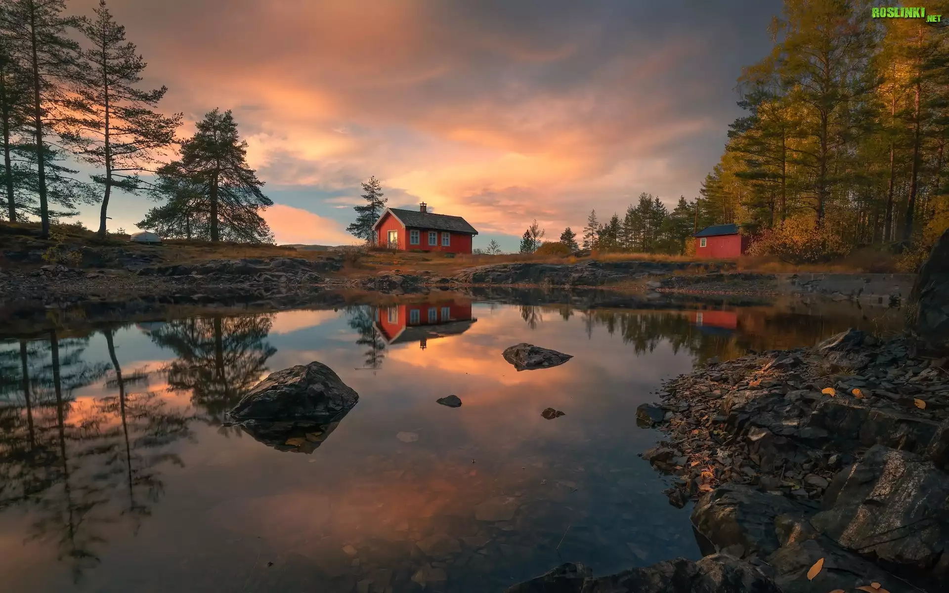 Rośliny: Norwegia, Ringerike, Jezioro Vaeleren, Drzewa, Dom, Odbicie