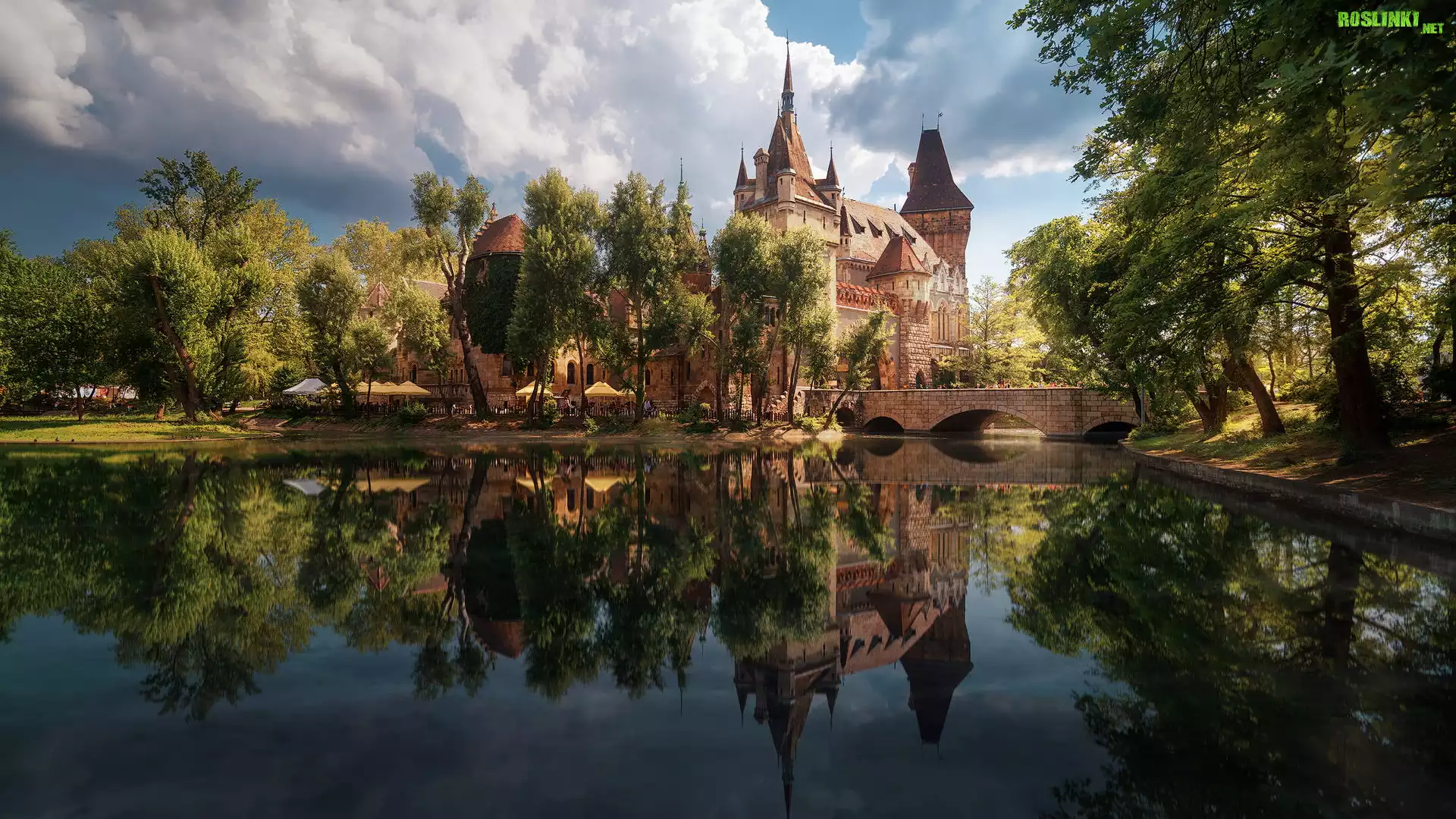 Rośliny: Zamek Vajdahunyad, Staw, Most, Drzewa, Budapeszt, Węgry