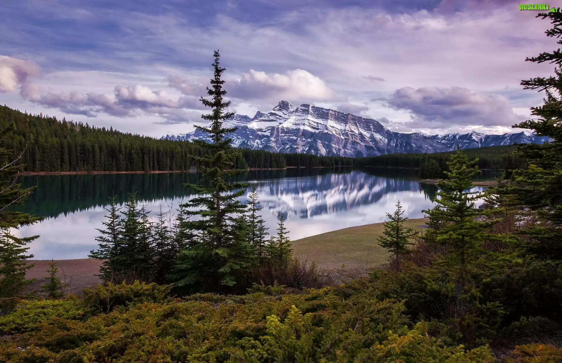 Rośliny: Kanada, Park Narodowy Banff, Jezioro Vermilion, Góry, Szczyt Mount Rundle, Lasy, Świerki
