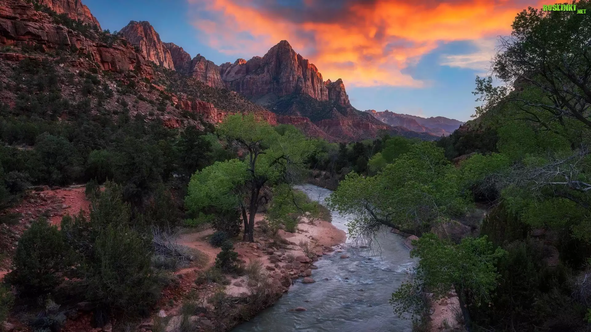 Rośliny: Góra Watchman, Rzeka, Virgin River, Drzewa, Chmury, Park Narodowy Zion, Utah, Stany Zjednoczone