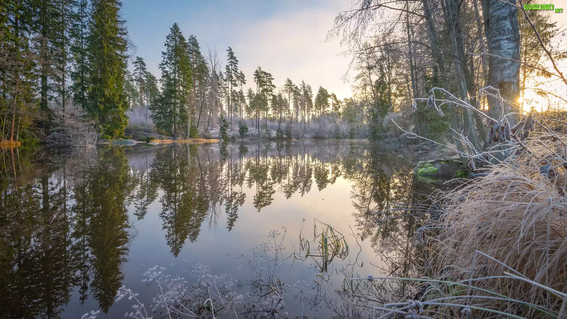 Rośliny: Rzeka Virojoki, Oszronione, Drzewa, Trawy, Region Kymenlaakso, Finlandia
