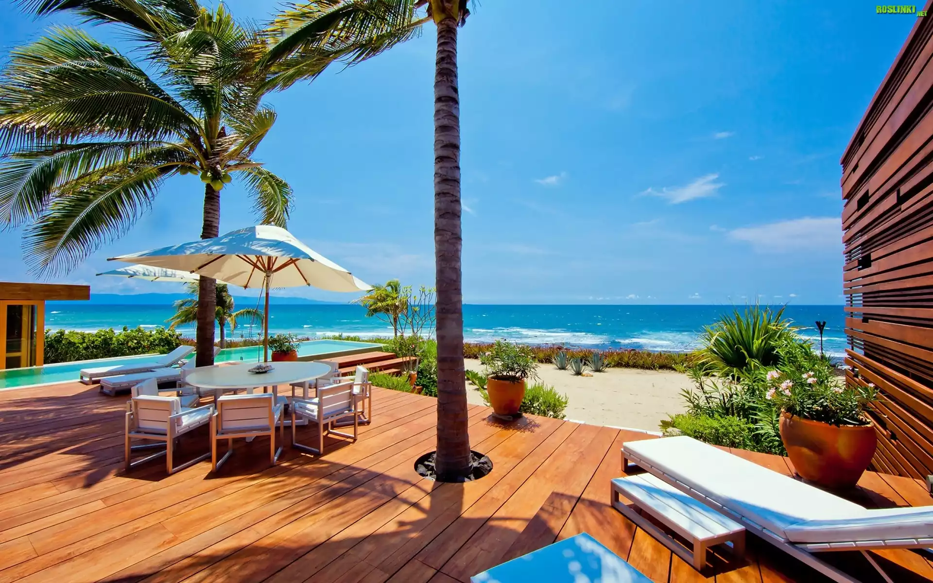 Rośliny: Hotel, Basen, Leżaki, Plaża, Palmy, Morze, Tropikalna, Wyspa, Wakacje
